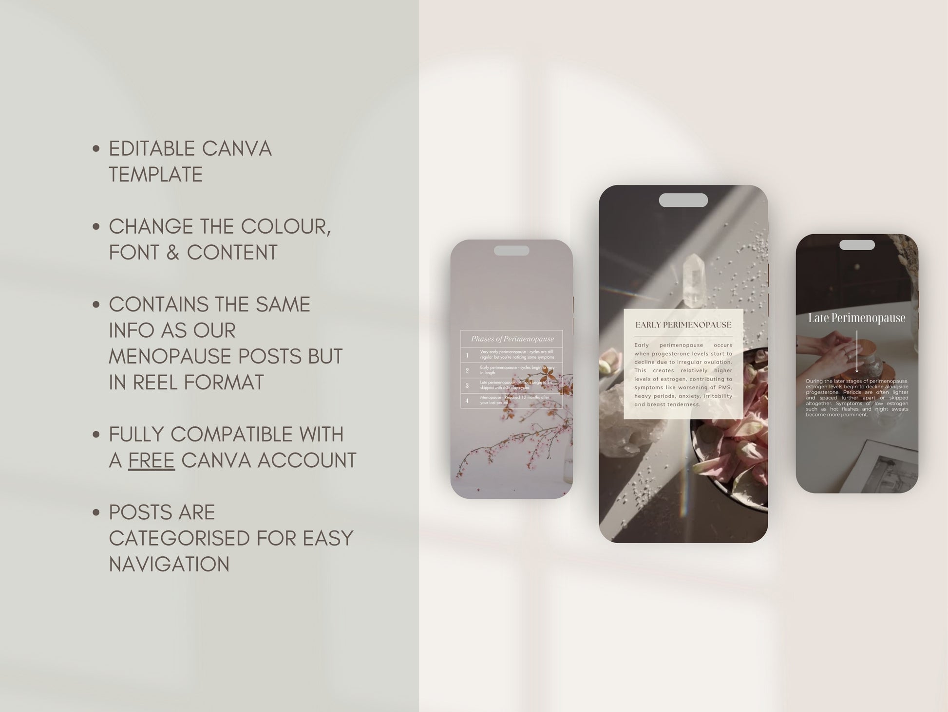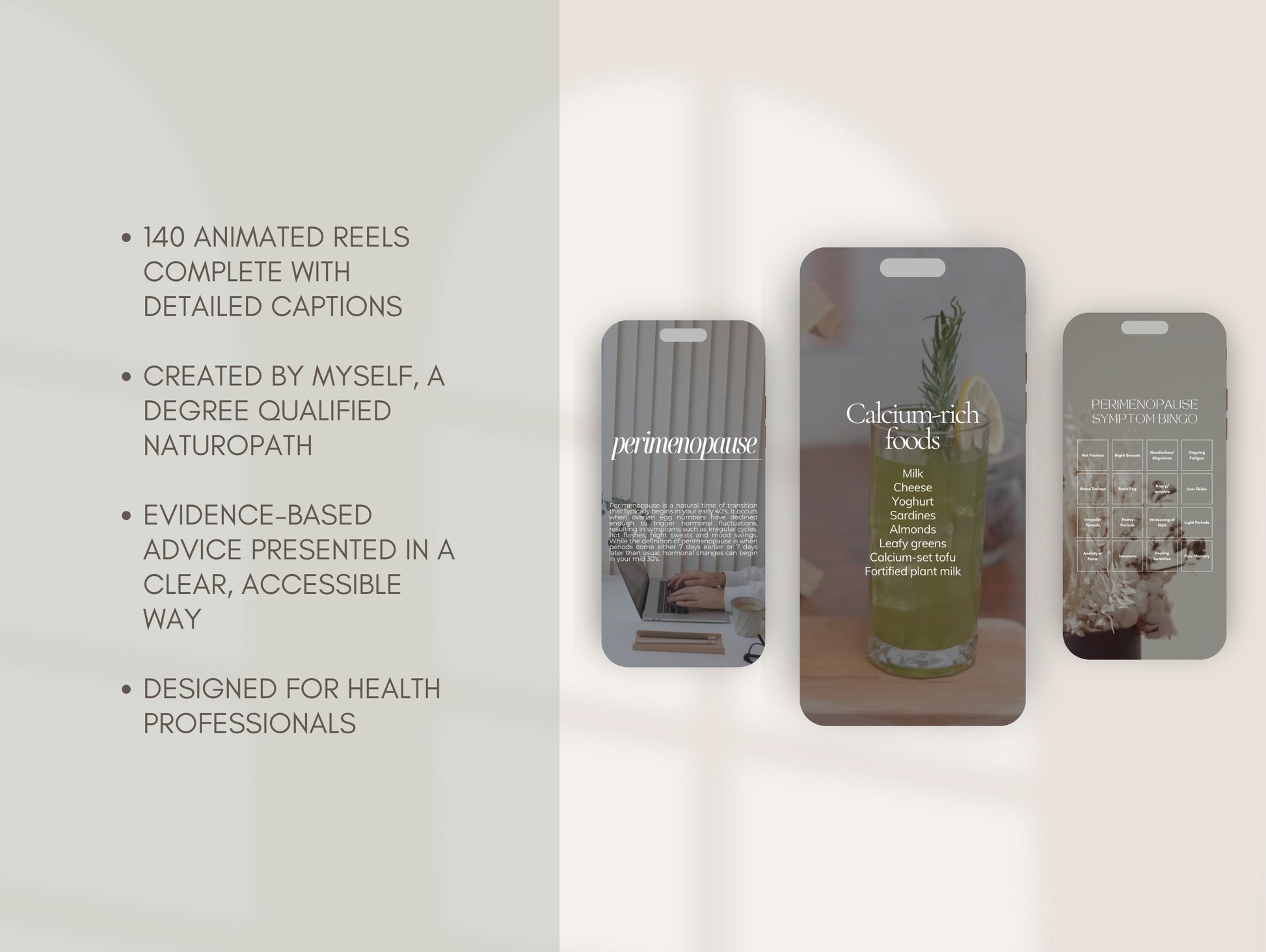 Introducing the most comprehensive collection of holistic perimenopause and menopause social media reels. Featuring 140 unique reels complete with detailed captions created by myself, a degree-qualified naturopath. Fully compatible with a free Canva account.