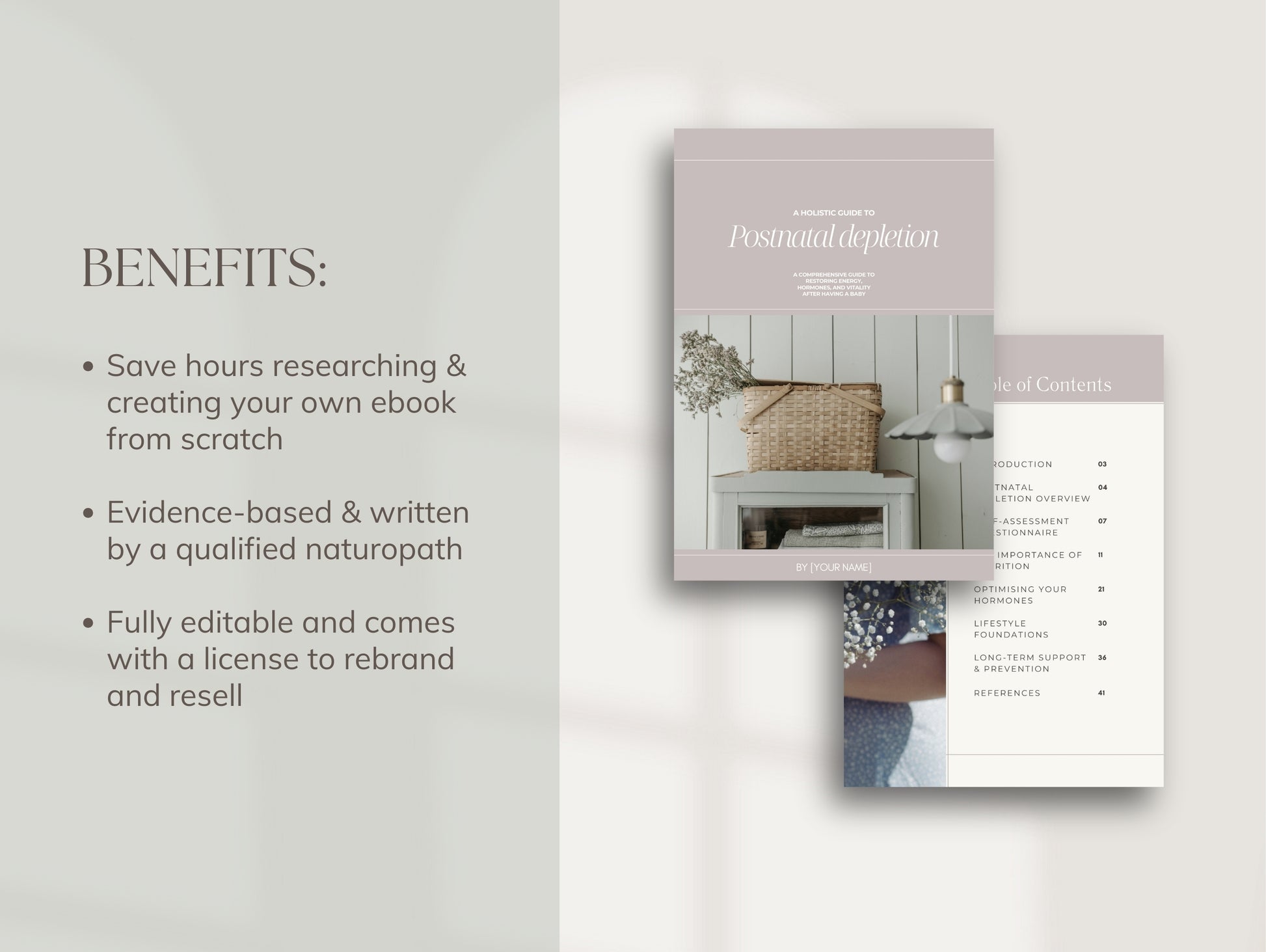 Are you a naturopath, nutritionist or other health professional looking for a premade ebook focused on postnatal depletion that you can edit, rebrand and sell on your website?