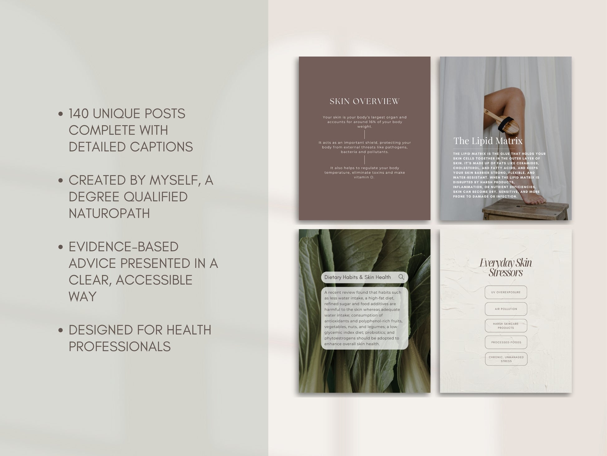 Introducing the most comprehensive collection of holistic skin health social media posts. Featuring 140 unique posts complete with detailed captions created by myself, a degree-qualified naturopath.