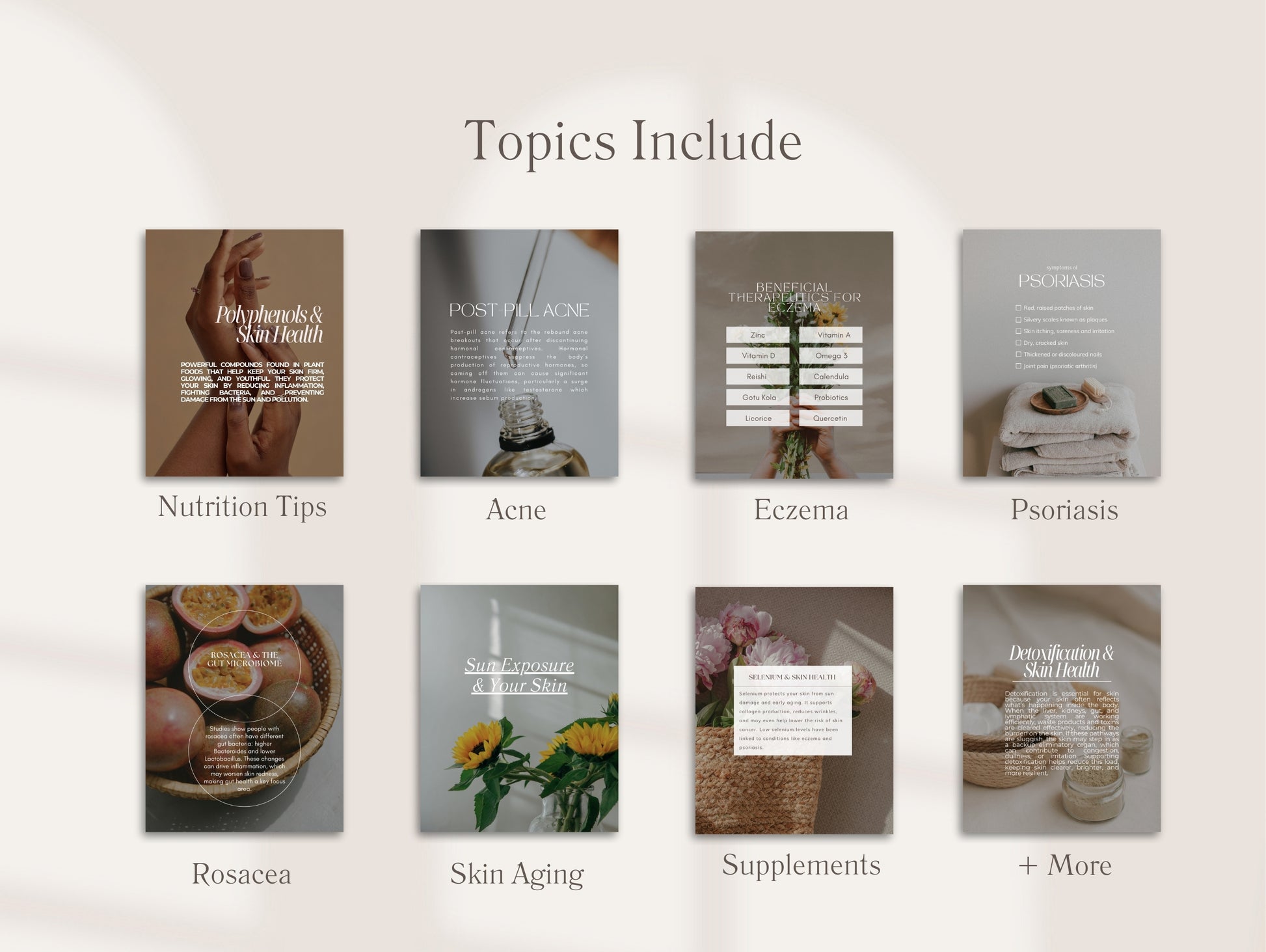 Introducing the most comprehensive collection of holistic skin health social media posts. Featuring 140 unique posts complete with detailed captions created by myself, a degree-qualified naturopath.